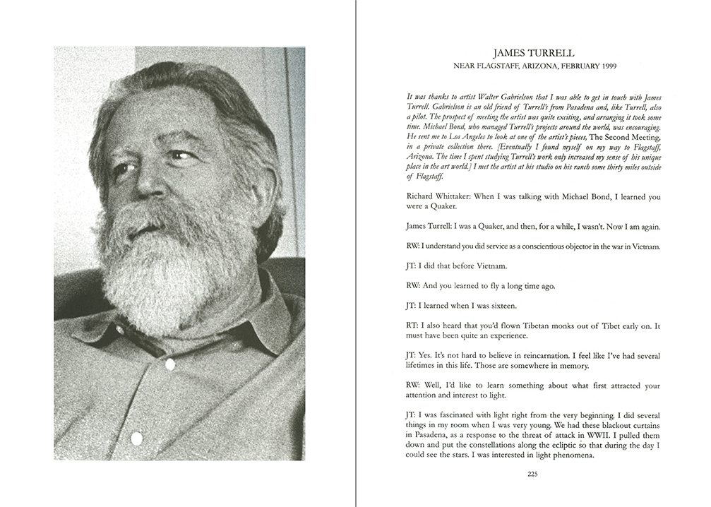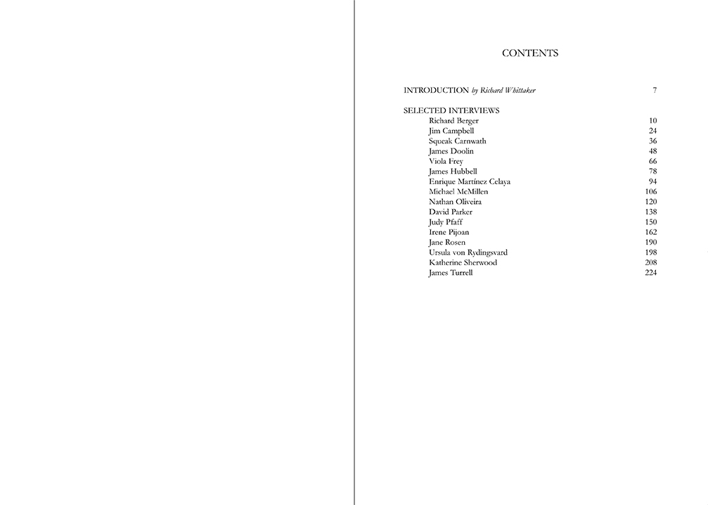 The Conversations brings together Richard Whittaker’s selection of what he considers the sixteen most relevant interviews, providing insight into the individual artists’ work, mistakes and philosophies as well as the social and cultural values in which they worked. The artists interviewed are Richard Berger, Jim Campbell, Squeak Carnwath, James Doolin, Viola Frey, James Hubbell, Enrique Martínez Celaya, Michael C. McMillen, Nathan Oliveira, David Parker, Judy Pfaff, Irene Pijoan, Jane Rosen, Katherine Sherwood, James Turrell, and Ursula von Rydingsvard.